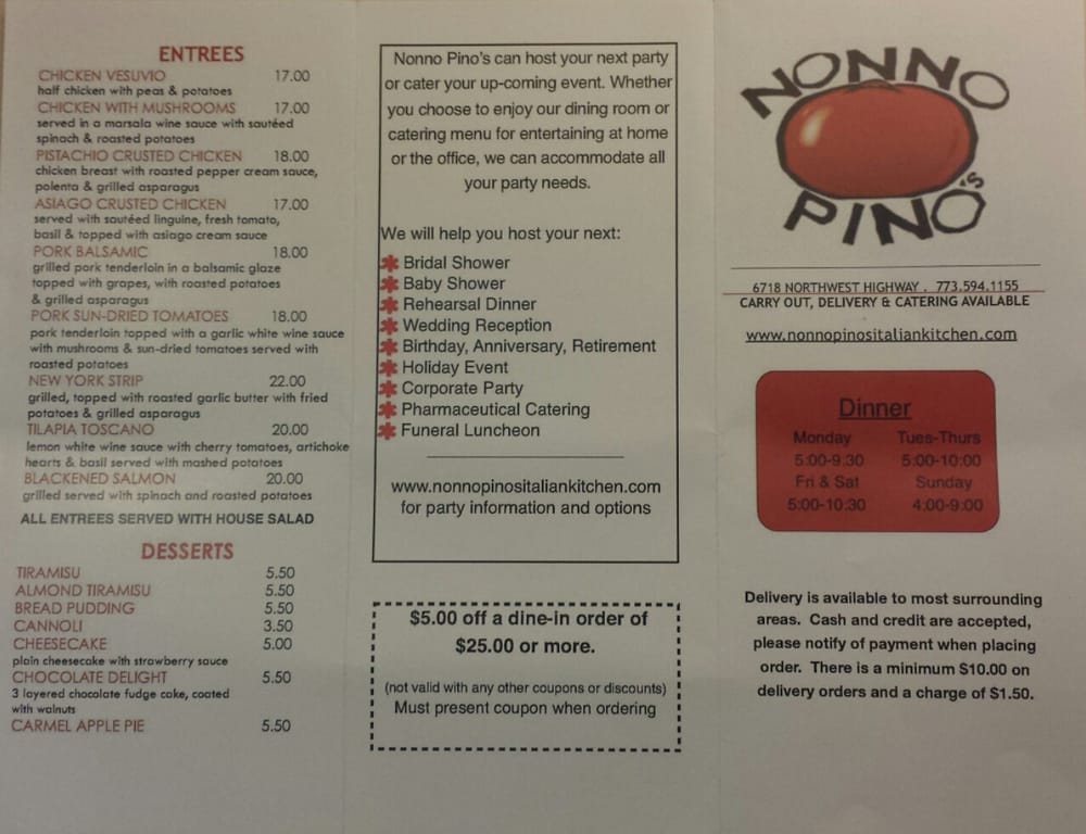 Welcome to Nonno Pino's, a cherished Italian gem nestled in Edison Park, Chicago. Known for its warmth and welcoming atmosphere, this restaurant/bar stands out with a menu that pays homage to authentic Italian cuisine. Highlights include the exquisite Pistachio Crusted Chicken, a customer favorite that never disappoints. The Pino Puffs serve as a delightful appetizer, boasting a crunchy exterior filled with a surprisingly moist interior, leaving diners craving more.